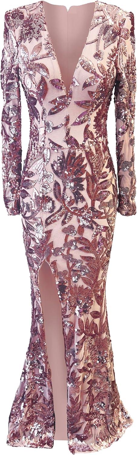 Command attention in the Alessandra dress, a stunning choice for any formal occasion. This mermaid gown features long sleeves, a plunging neckline, and a daring slit, all adorned with dazzling sequins that catch the light with every move. Crafted from luxurious fabric, the Alessandra dress combines glamour and sophistication for a show-stopping look.