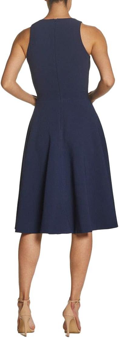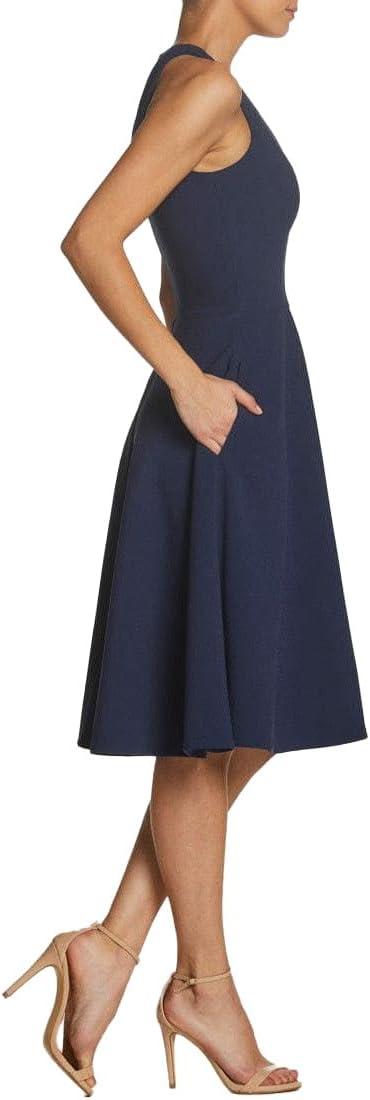 Sleeveless plunging A-line crepe knee length dress with pockets.