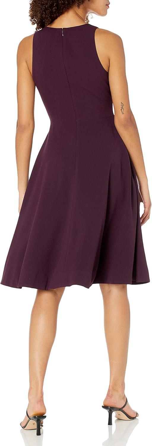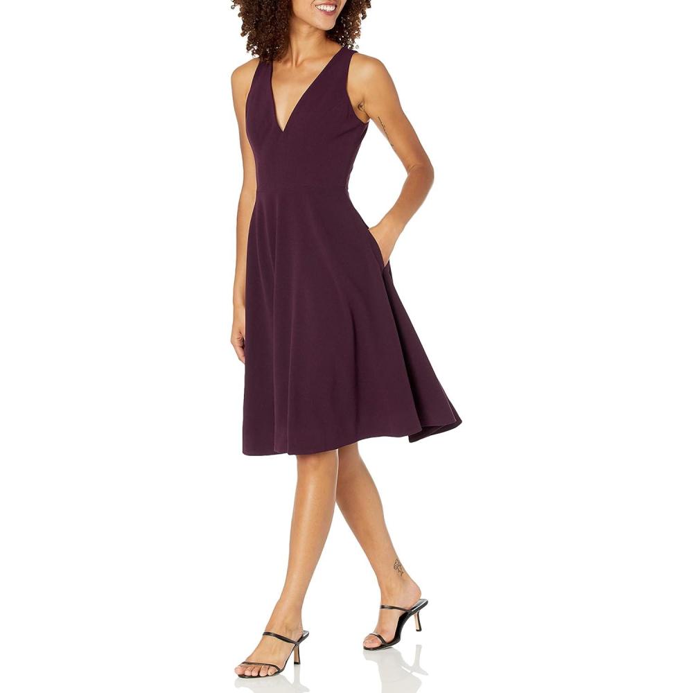 Sleeveless plunging A-line crepe knee length dress with pockets.