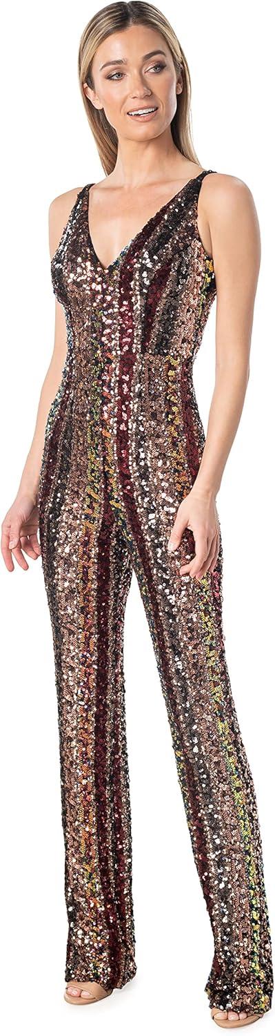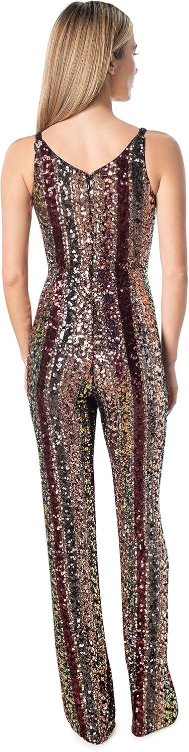 Dress the Population Women’s Charlie Plunging Sequin Sleeveless Jumpsuit(Bronze Multi)