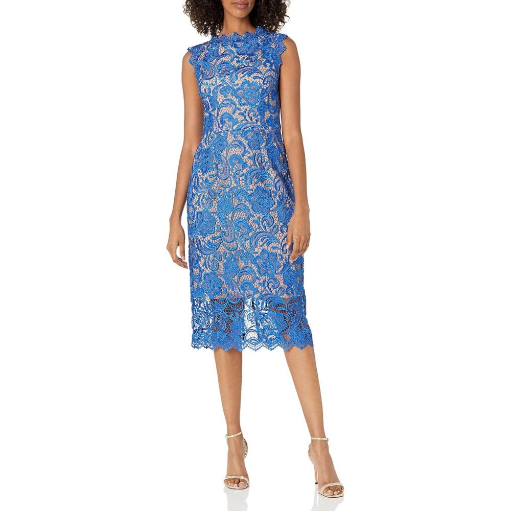 Dress The Population Womens Claudette Lace Sheath Midi Dress(Cobalt/Nude)