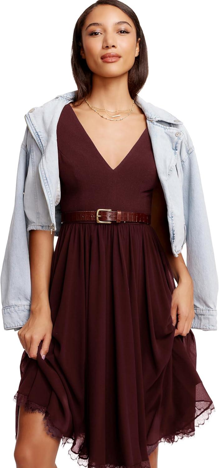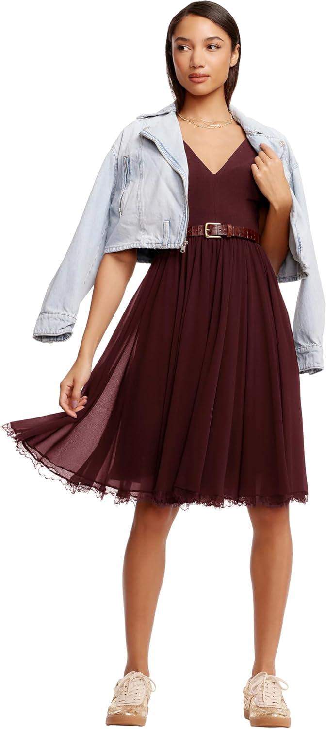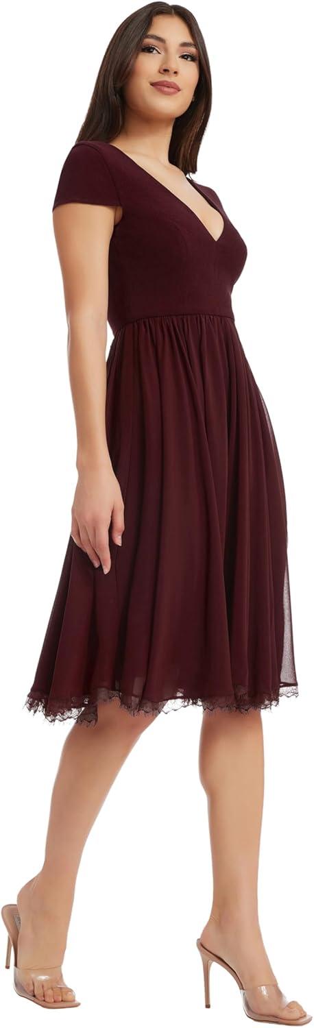 Dress the Population Womens Corey Plunging Mix Media Cap Sleeve A-line Midi Dress(Burgundy)