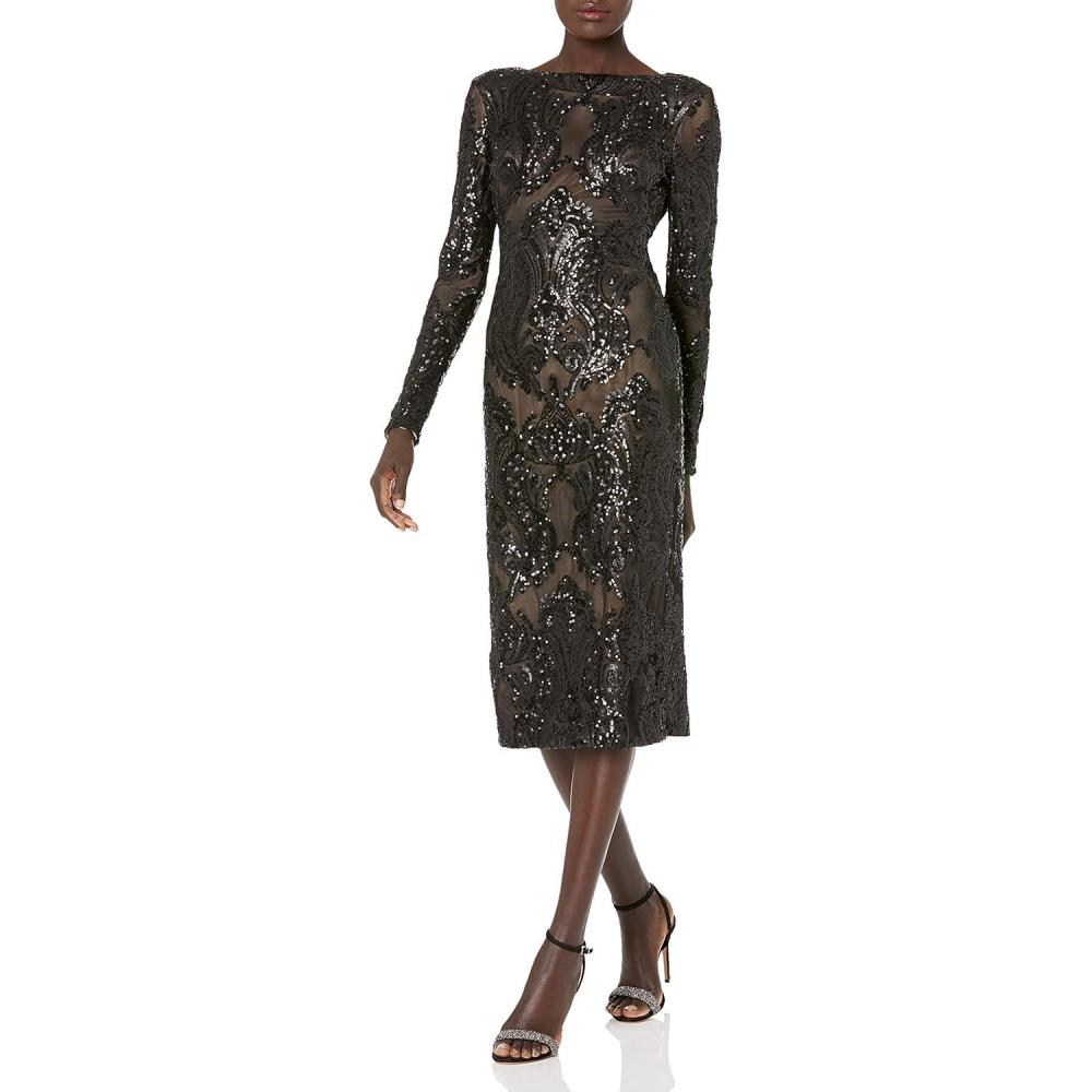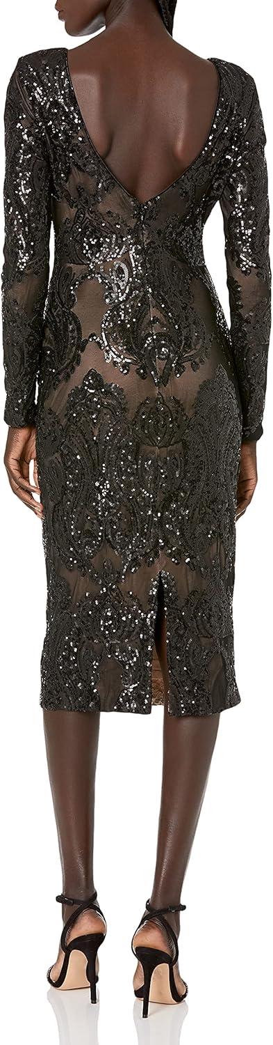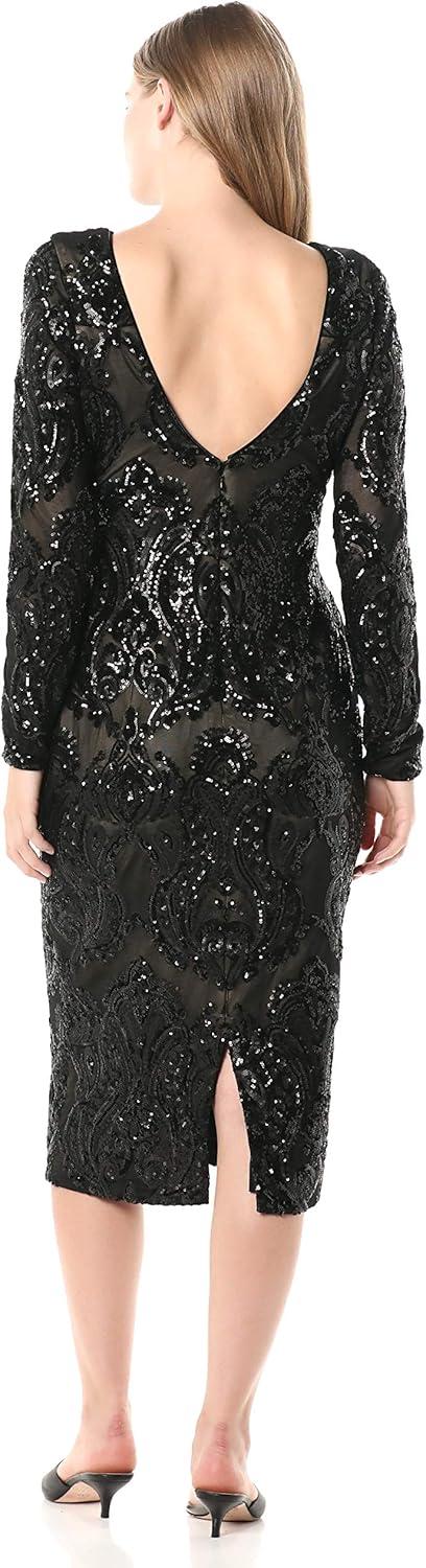 Dress the Population Womens Emery Long Sleeve Stretch Sequin Midi Sheath(Black/Nude Baroque)