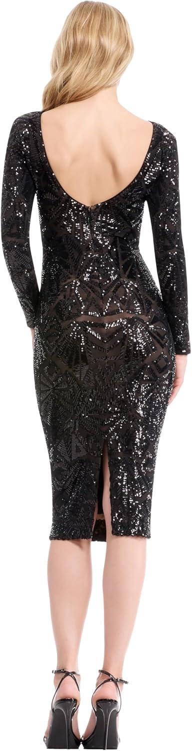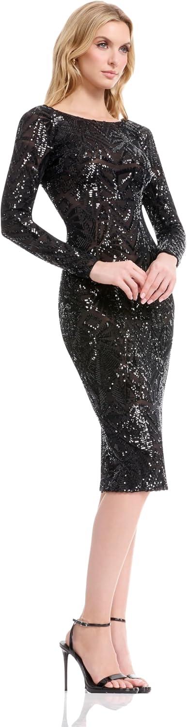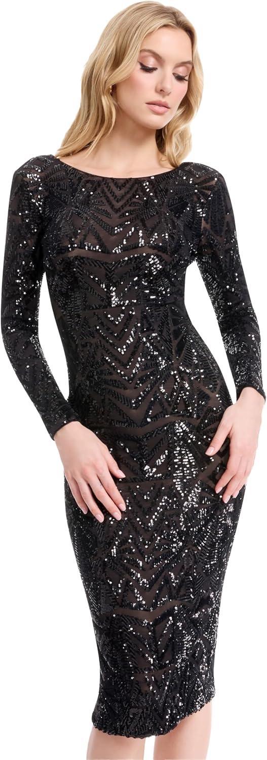 Dress the Population Womens Emery Long Sleeve Stretch Sequin Midi SheathDress(Black)