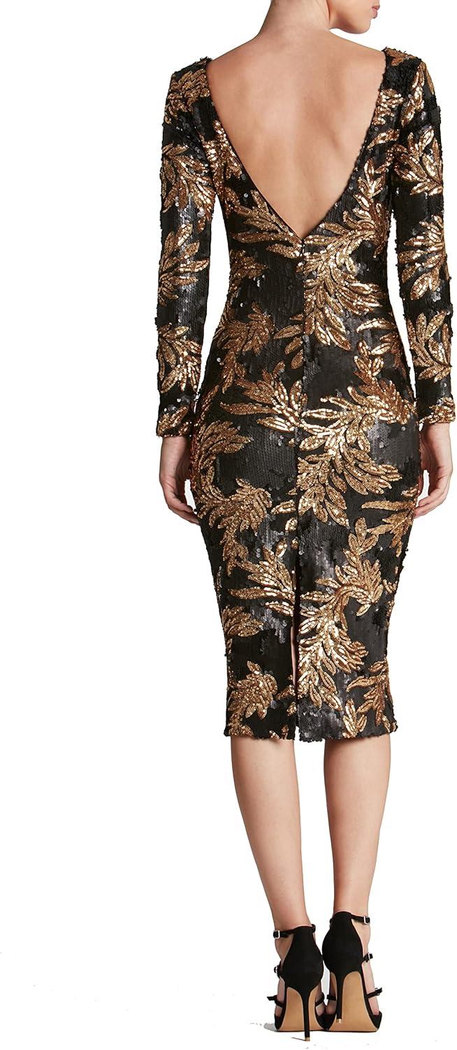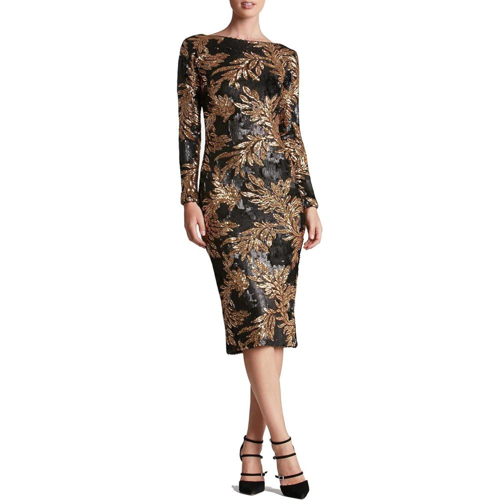 Dress the Population Womens Emery Long Sleeve Stretch Sequin Midi SheathDress(Matte Black/Gold)