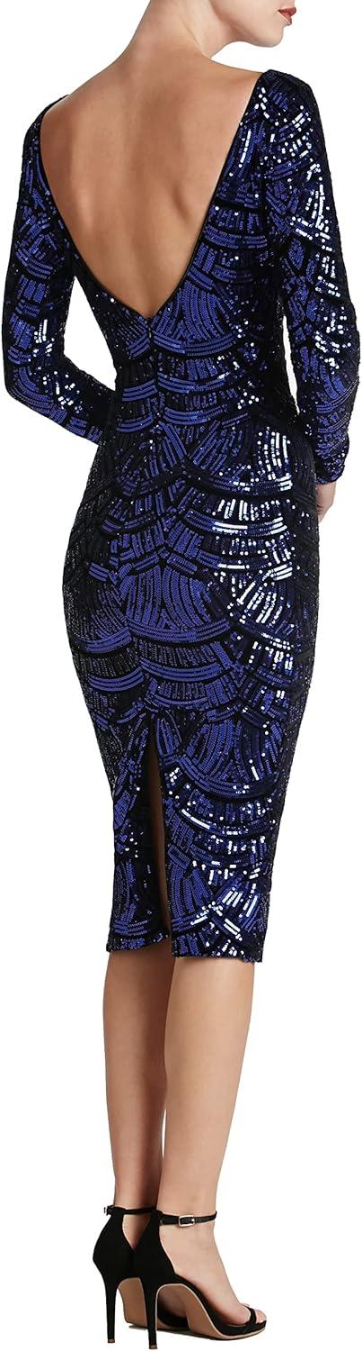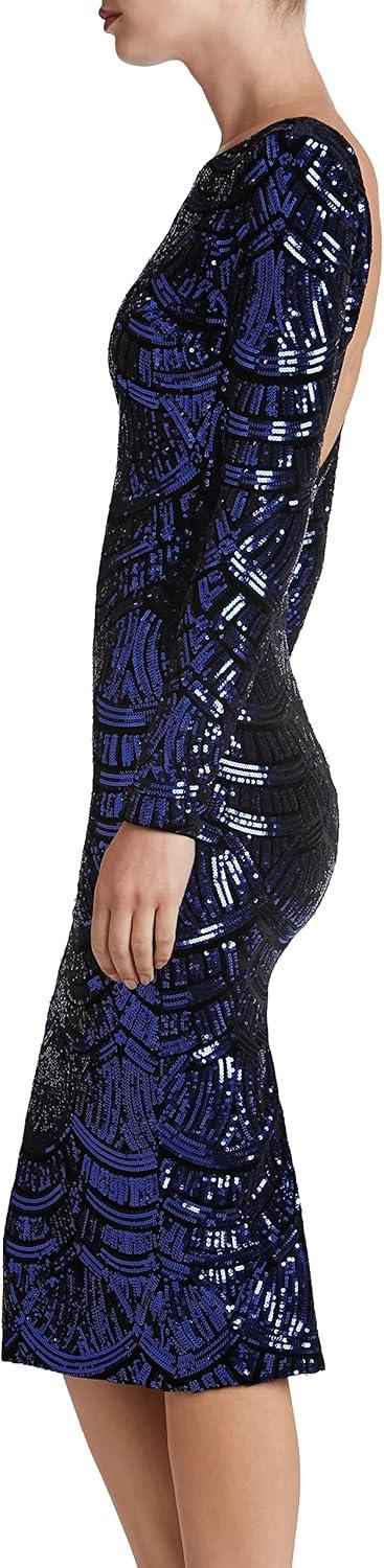 Dress the Population Womens Emery Long Sleeve Stretch Sequin Midi SheathDress(Royal Purple/Black)