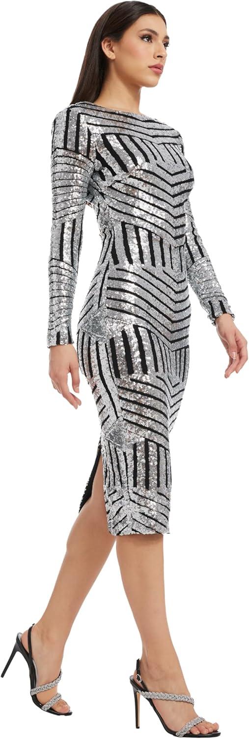 Dress the Population Womens Emery Long Sleeve Stretch Sequin Midi SheathDress(Silver/Black)