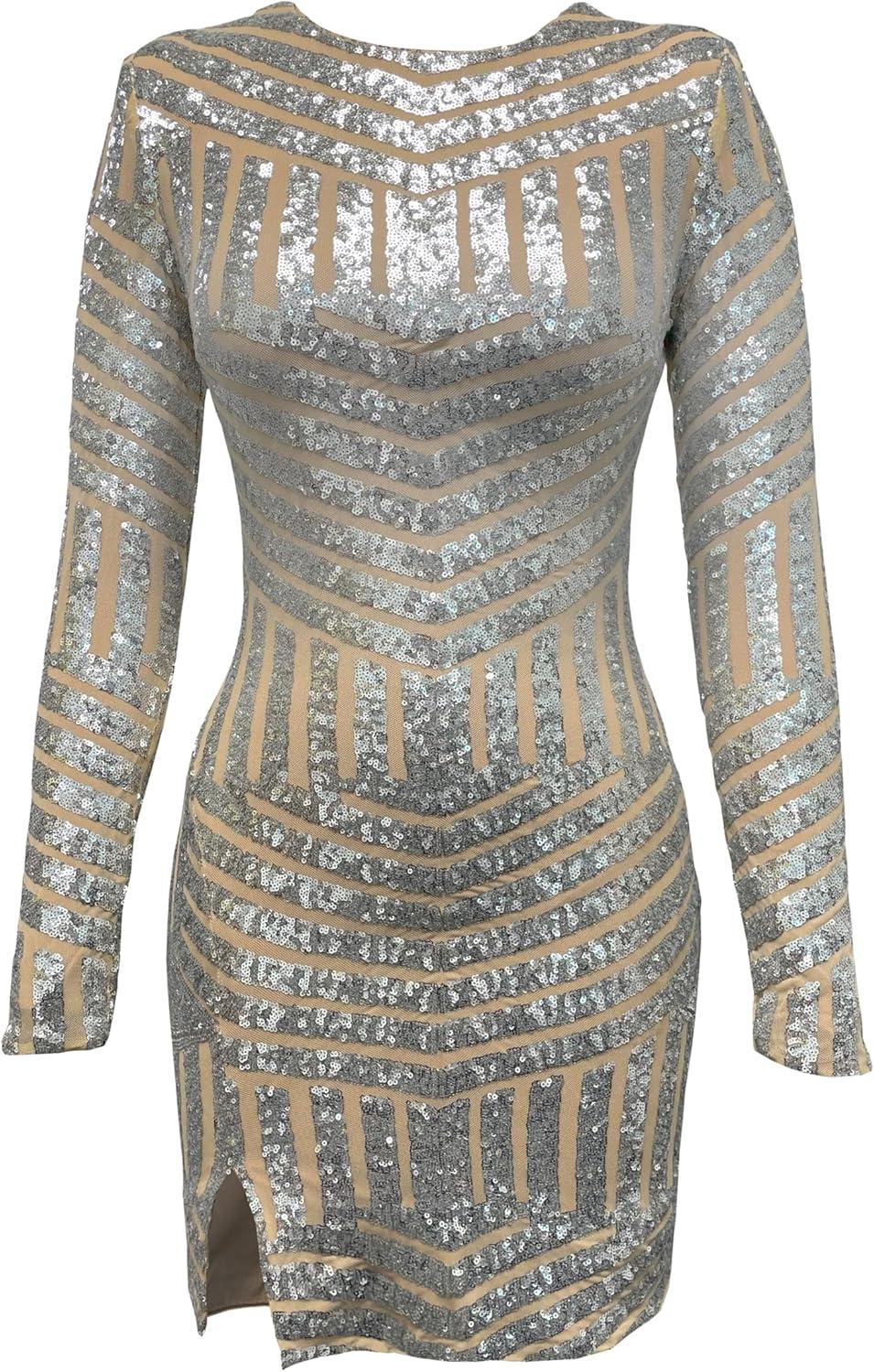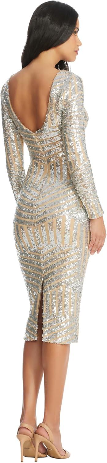 Dress the Population Womens Emery Long Sleeve Stretch Sequin Midi SheathDress(Silver/Nude)