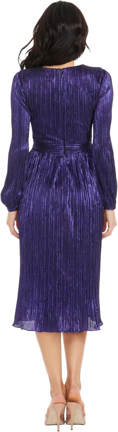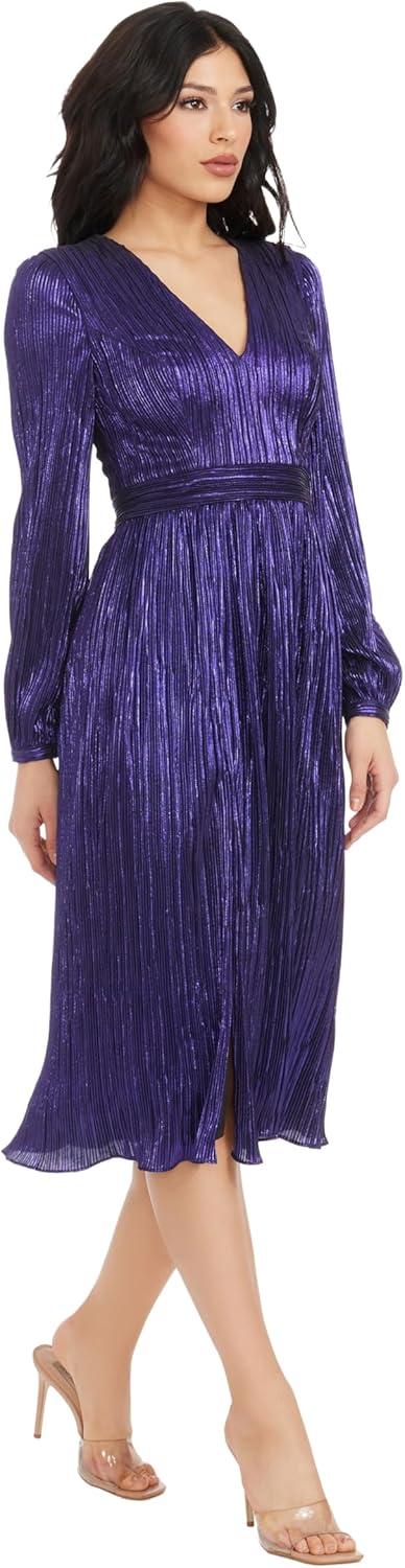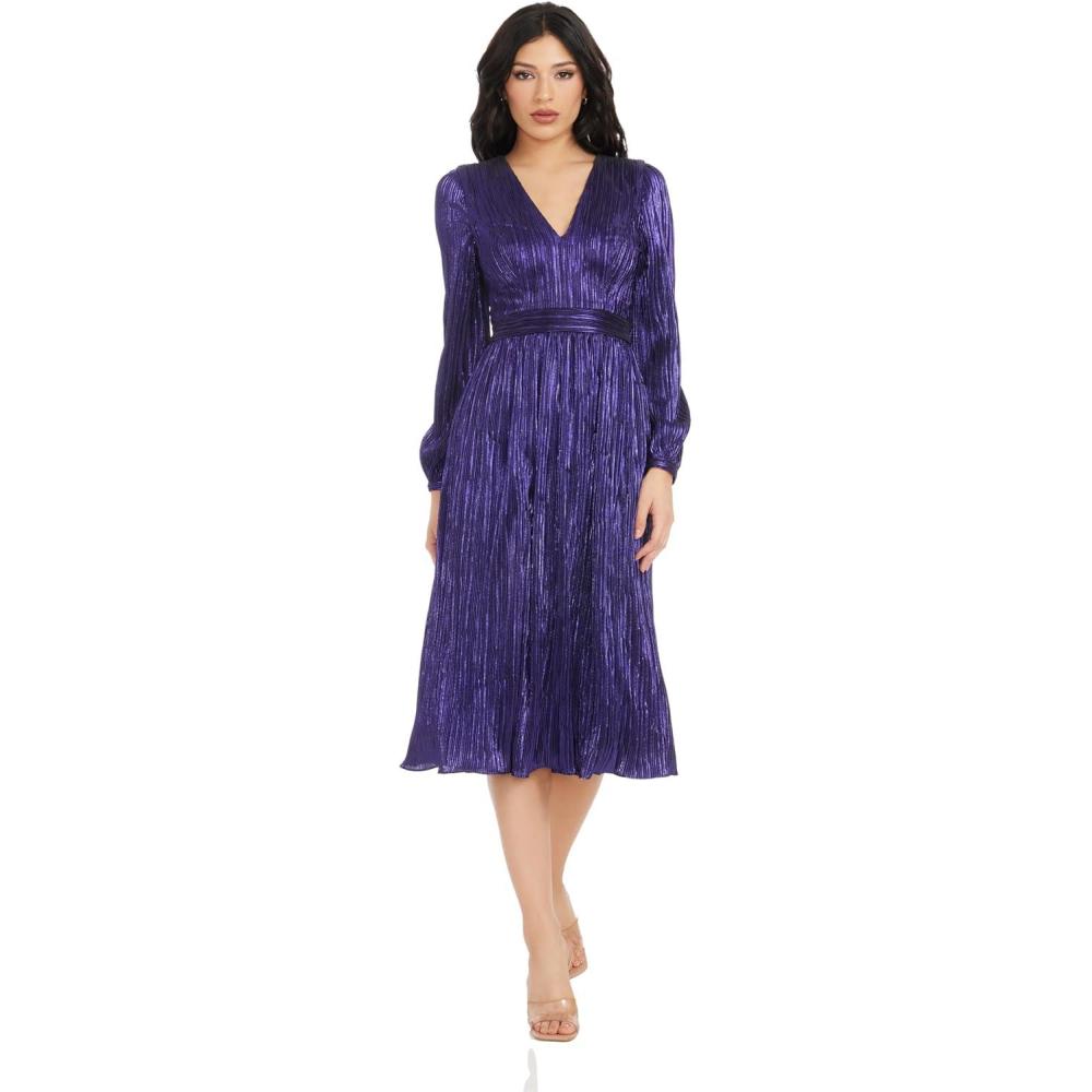The Holly Dress from features a flattering fit and flare silhouette. With a plunging neckline and bishop sleeve, this midi dress provides an air of elegance and sophistication. Perfect for special occasions or nights out on the town.
