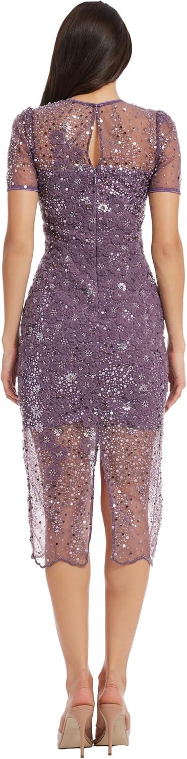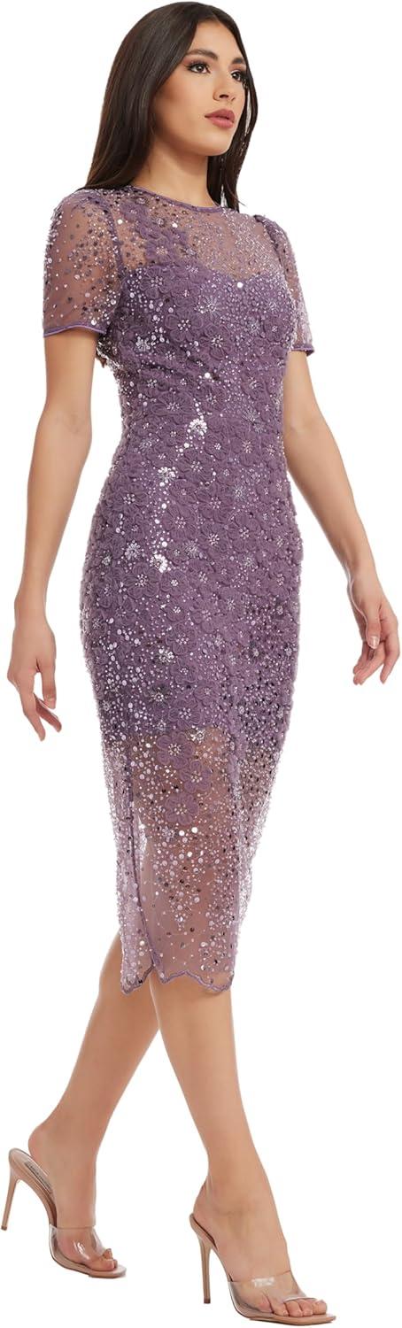 This short-sleeved cocktail dress is a dazzling fit for any occasion. With sequin details throughout, Lia's sparkling body-con silhouette is sure to turn heads. This dress has an overlay with that hits at the knee with a tantalizing mini skirt underneath and a slit in the back for style and mobility. The fabric does not stretch and the dress has a center-back zipper with a hook and eye.
