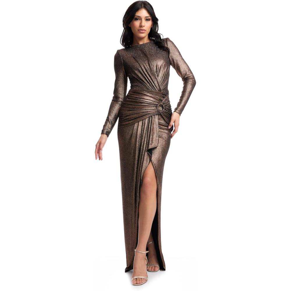 Expertly crafted with a long sleeve design and round neck, the Romera Dress is a stunning sheath gown that will make you stand out at any event. The wrapped and draped detailing adds a touch of elegance to this timeless piece. Perfect for any formal occasion.