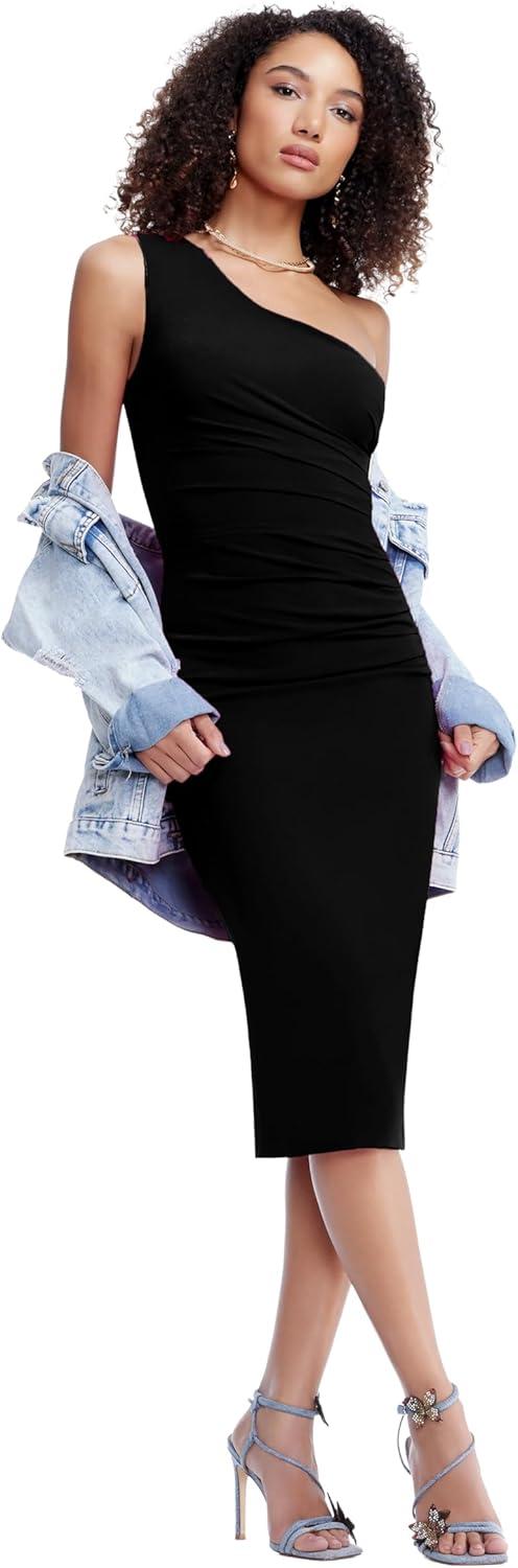 Sleeveless Asymmetrical One Shoulder Side Pleat Bodycon Midi Dress